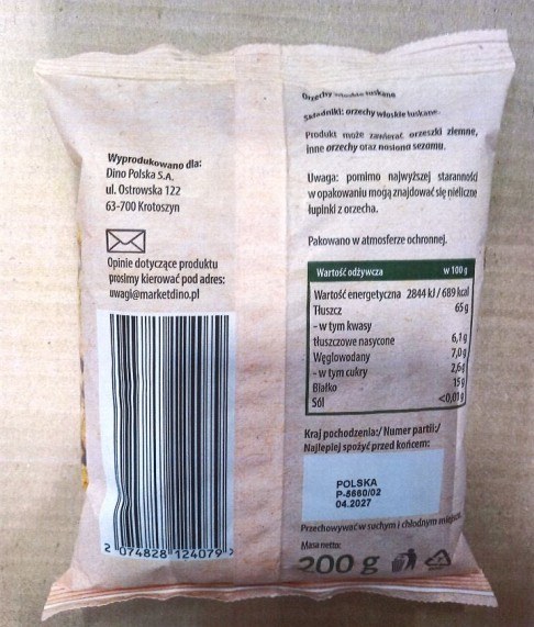 Chodzi o produkt: Orzechy włoskie łuskane Bakaliowy Targ, 200 g, z numerem partii: P-5660/02 i datą ważności: 04.2027, a wyprodukowane dla: Dino Polska S.A., ul. Ostrowska 122, 63-700 Krotoszyn.
